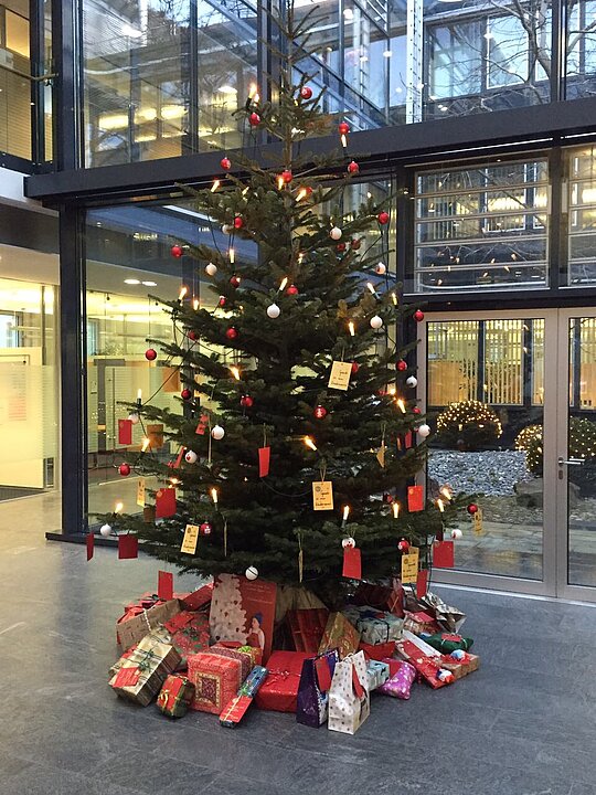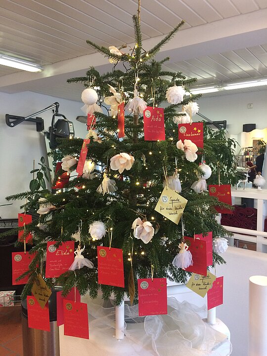 In der Adventszeit konnten Bürgerinnen und Bürger rote Wunschkärtchen von Weihnachtsbäumen auswählen, den darauf stehenden Wunsch erfüllen und das Geschenk wieder abgeben. Die Bäume standen:
